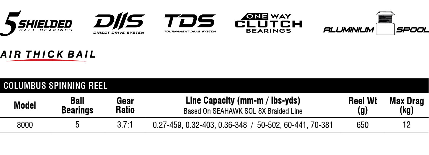 Seahawk Columbus 8000 is your essential weapon for tackling the biggest, hardest-fighting fish. This spinning reel is the definition of strength, harnessing a brutal max drag of up to 12kg through its Tournament Drag System (TDS) to conquer any offshore giant. The Columbus 8000 also has a Direct Drive System (DIIS) that offers an ergonomic soft rubber T-knob for a comfortable grip and effortless retrieval.